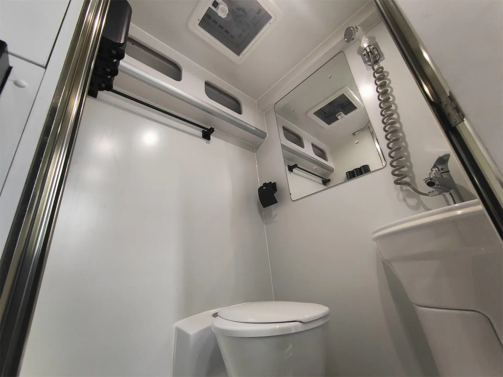 While retaining the Thetford cassette toilet, we have upgraded the shower tap set, added toilet paper holders, towel racks, and soap dispensers.