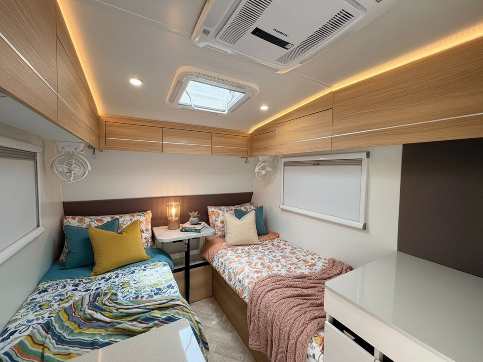 Smart interior design with twin single beds, delivering comfort and practicality in a compact caravan.