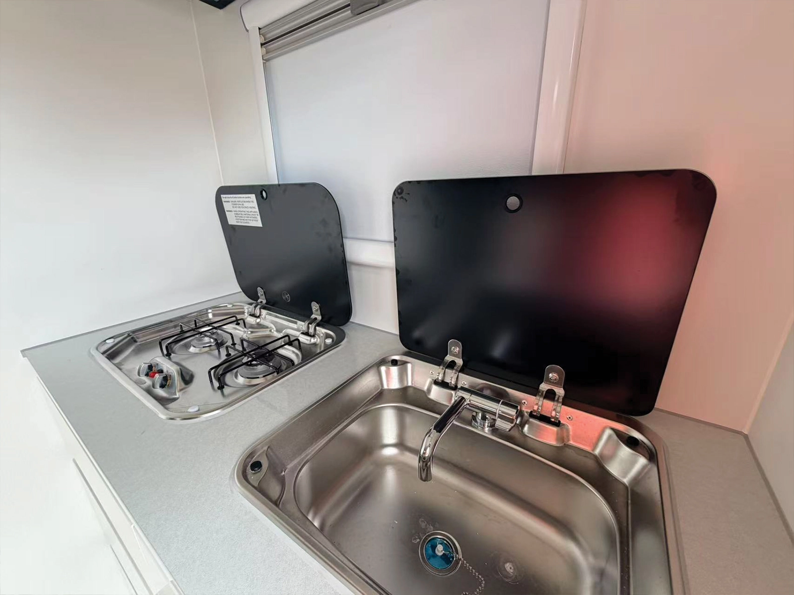 Well-appointed interior kitchen with a 2-burner gas cooktop and sink – everything you need to cook comfortably while travelling.